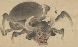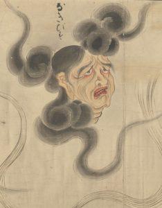 The hand painted scroll itself contains depictions of 35 ‘bakemono‘ it is in a remarkable state of preservation, measuring 44x1525cm in size. There is also extensive use of gold pigment throughout within the ‘background mists’ of the scroll. Most of the creatures on the scroll are well known, however some of them, such as the Umibōzu, Umiotoko , Nurikabe , Nakibisu , and the three-eyed Tsuchigumo are seldom seen.