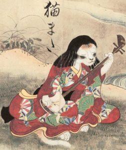 Depictions in the Hyakki Zukan (below) show the Nekomata in the garb of a Geisha playing a shamisen. The tail of the creature is not forked.