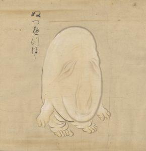 The story (first written by Maki Bokusen) states that the creature appeared one day in Tokugawa Ieyasu‘s garden. The Shogun quickly had the creature taken away, as he found the appearance of the ‘meat man’ to be unsettling. Later, a wise man approached the Shogun saying the creature resembled the legendary Hō and that one bite of the creatures flesh would have reinvigorated your constitution.1