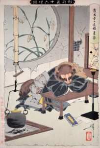 | Fujiwara Hidesato from the tale My Lord Bag of Rice. | Depiction of Okiku. |